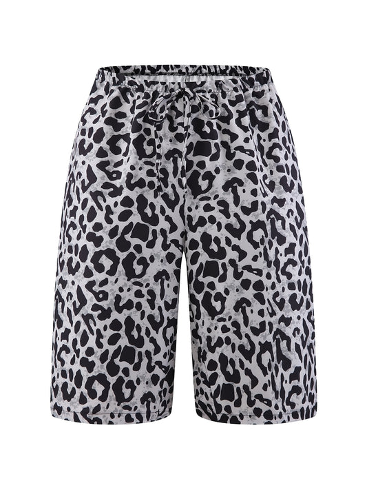 Կանացի Plus Size Leopard Print լայնածավալ լողափնյա շորտեր - պատահական արձակուրդային ոճ, բարձրահարկ արհեստական թելերով, թեթև պոլիեսթեր, սև և մոխրագույն կենդանիների նախշ, կատարյալ ամառային զբոսանքների համար, ծովափնյա շորտեր | Արևադարձային Վակատի
