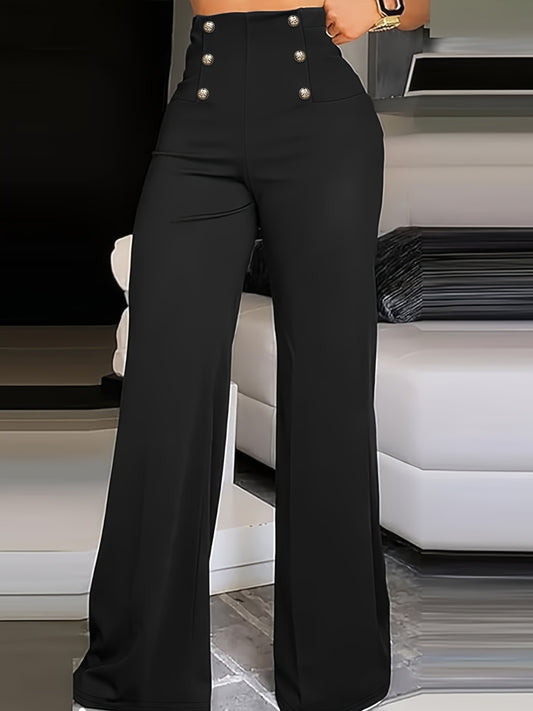 Կանացի էլեգանտ բարձր գոտկատեղով լայն տաբատ՝ սև պոլիեսթեր ուղիղ ոտքը կոճակով, բոլոր սեզոնային նորաձև տաբատ՝ ամենօրյա կամ զգեստավոր հագուստի համար