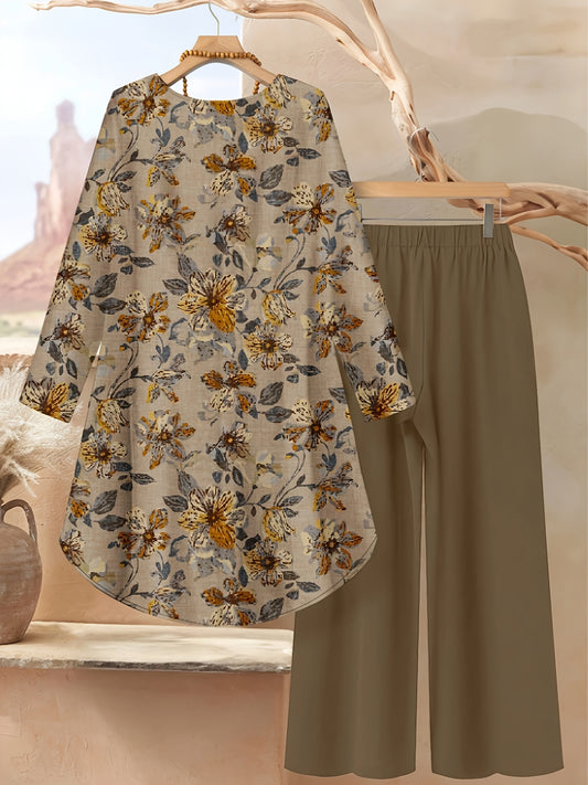 Կանացի էլեգանտ, առօրյա, ծաղկային նախշերով երկար թևքերով վերնաշապիկ և ազատ տաբատ՝ երկու մասից բաղկացած հավաքածու