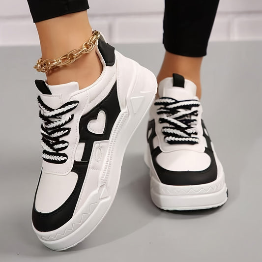 Կանացի նորաձև, սև և սպիտակ, սրտային նախշերով սպորտային կոշիկներ՝ հաստ ներբանով, ժանյակավոր կոշիկ՝ չսահող ռետինե տակացուով բոլոր եղանակների համար