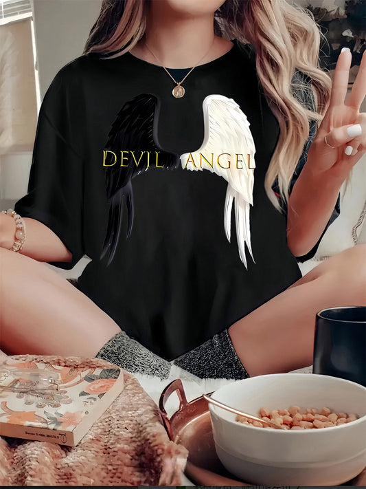 1 հատ Angel & Devil Wings Գրաֆիկական տպագրության վերնաշապիկ կանանց համար, պատահական վզով կարճ թև, պոլիեսթեր տրիկոտաժե գործվածք միջին ձգվածքով, բոլոր սեզոնային նորաձև վերնաշապիկ