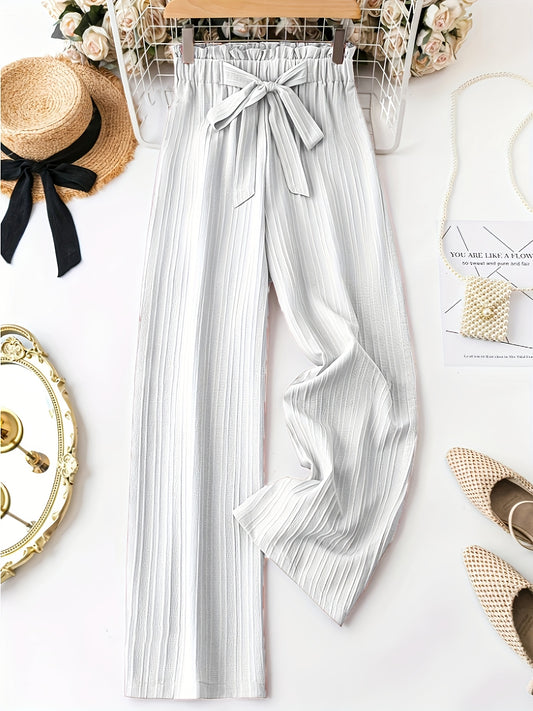 Կանացի էլեգանտ ուղիղ տաբատ՝ պոլիեսթեր, միաձույլ գույնի հյուսվածքով, լվացվող մեքենայով, հարմարավետ տեղավորվում է էլաստիկ գոտկատեղով և դեկորատիվ աղեղով