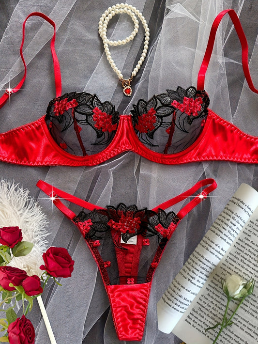 Կանացի ծաղկային ասեղնագործության ցանցային կրծկալ և վարտիքի հավաքածու, սեքսուալ թափանցիկ ներքնազգեստ, միջին հենակետային տրիկոտաժե գործվածք, պոլիեսթեր 95% էլաստան 5%, երեկույթների ոճ, մեծահասակների ռոմանտիկ ներքնազգեստ ժամադրության և երեկույթների համար