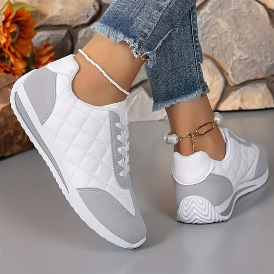 Women's Casual Low-Top Sneakers - Trendy Color Block Design, Light Gray with Navy Blue & Red Stripes, Comfortable Lace-Up Shoes for Casual Attire, Retro Style, Faux Cover Upper, PVC Sole, EVA Insole, Perfect for Spring and Fa