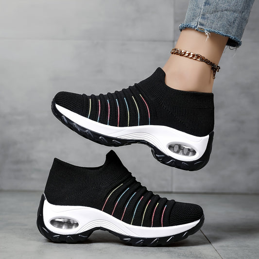 Կանացի տրիկոտաժե պատահական սպորտային կոշիկներ - Նորաոճ գծավոր գործվածքի նախշ, շնչող չսահող հարմարավետ կոշիկներ՝ ռետինե տակացով՝ բացօթյա հագուստի համար