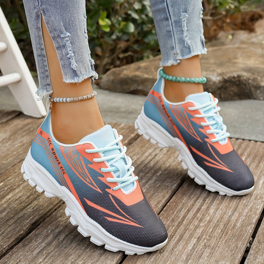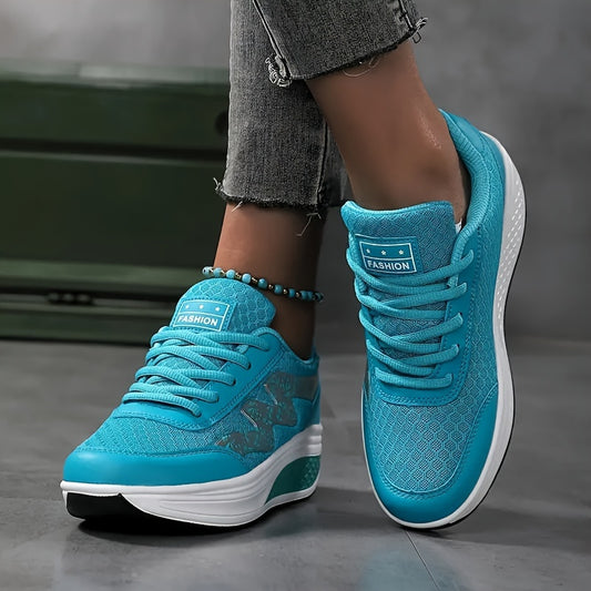 Կանացի բաց կապույտ, շնչող ցանցկեն սպորտային կոշիկներ՝ օդային բարձիկներով, հաստ ներբանով, սպորտային կառավարման համակարգով, կապիչներով դիզայնով, բոլոր եղանակների համար