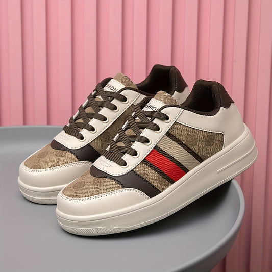 Women's Color-Block Striped Patchwork Skate Sneakers with Letter Pattern - Synthetic Cover Fabric Upper, EVA Cushioned Sole, Round Toe Lace-Up Casual Shoes for Outdoor Sports Casual Attire, Skate Shoes, Lifestyle, Sporty