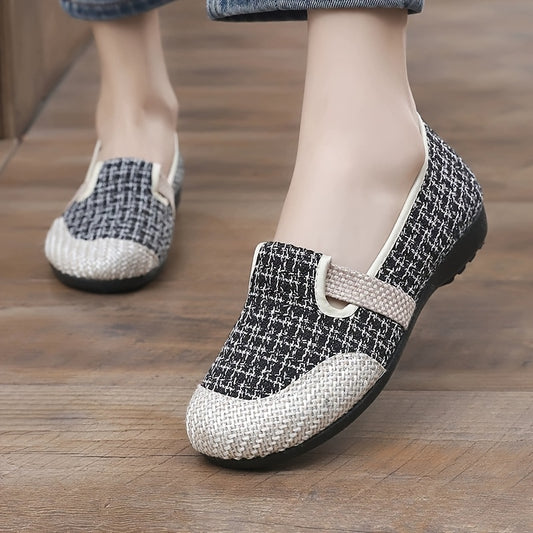 Մի զույգ կանացի երկրաչափական լոֆերներ, կլոր ծայրով, չսահող սպիտակեղեն խցաններ, պատահական հարթ կոշիկներ: