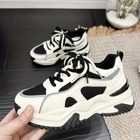 Կանացի շնչառական ցանցով հաստ սպորտային կոշիկներ՝ բազմակողմանի բոլոր սեզոնային, միջին վերևի ժանյակավոր սպորտային կոշիկներ բեժ/շագանակագույն և սև/սպիտակ, արհեստական ծածկույթ՝ ռետինե տակացուով, հեշտ խնամք, բարձր վերնաշապիկ սպորտային կոշիկներ