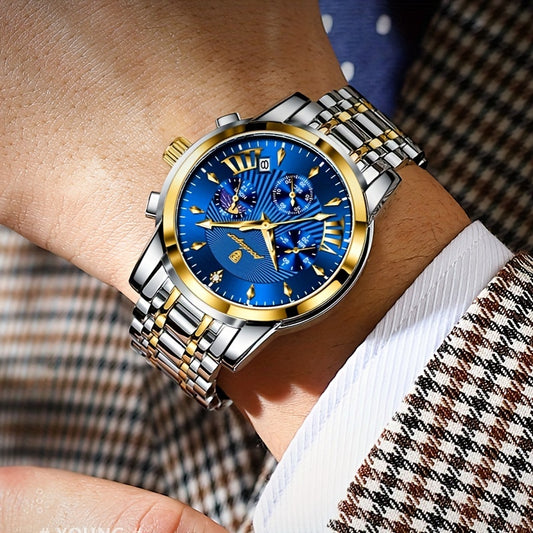 [Sophisticated Charm] Men's Multifunctional Fashion Watch - Waterproof Quartz Wristwatch with Chronograph, Stainless Steel Band, Blue Dial & Golden Accents, Ideal Gift for Men, Casual Timepiece|Contemporary Watch|Golden Accen