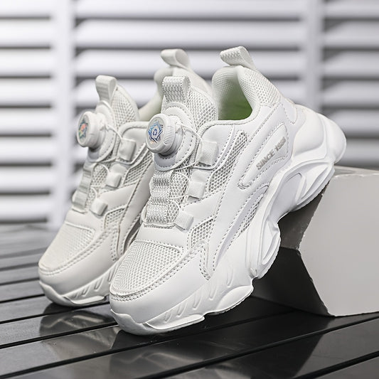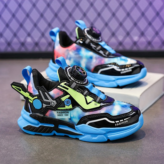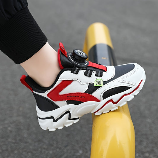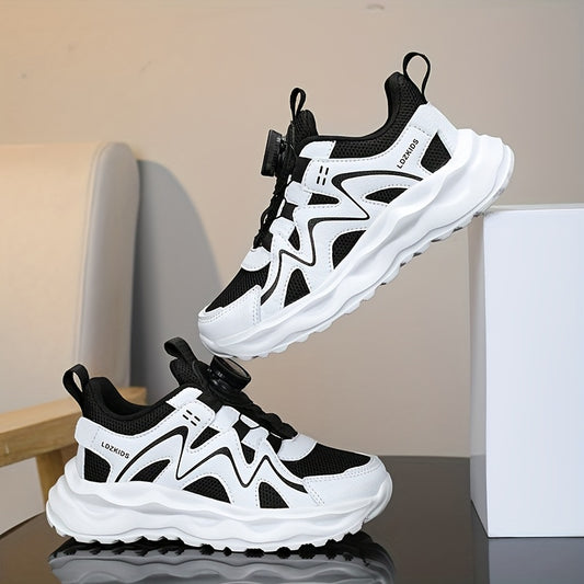 Boys' Striped Sneakers with Rotating Buckle - Casual Running Shoes for Youngsters, Breathable PU & Fabric Lining, Non-Slip EVA Sole