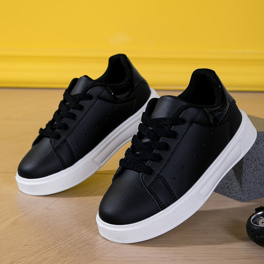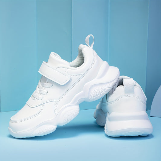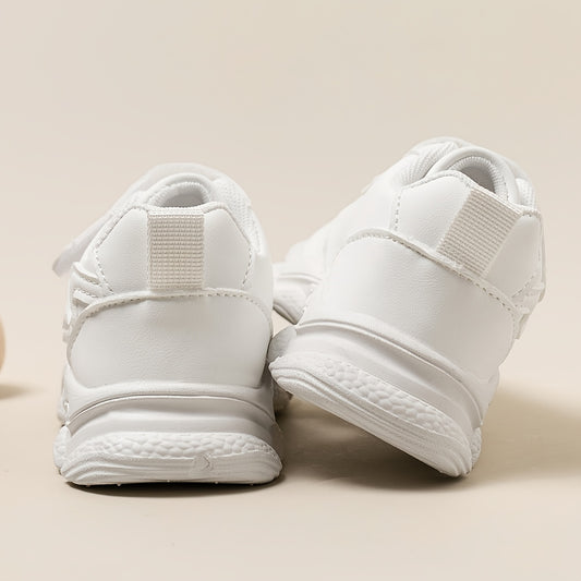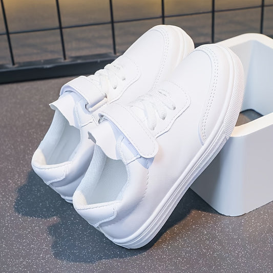 Preppy Style Solid Color Casual All-Season Low Top Sneakers for Boys and Girls with Adjustable Strap Closure, PU Upper, Fabric Lining, and Durable Rubber Sole, Perfect for Daily Wear & School Under 14 Years - White