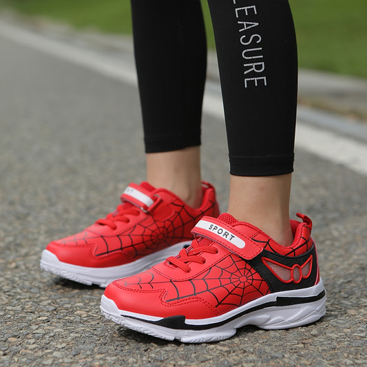 Kids Fashion Sneakers Breathable Lightweight Sport Casual Shoes with Cartoon Spider Web Design, Closure, Low Top PU and Fabric for Boys and Girls – Versatile All-Season Footwear for Outdoor Activities