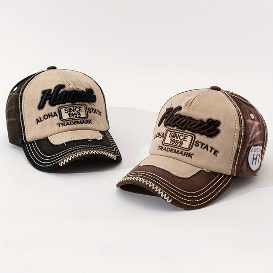 Vintage "Hawaii" Embroidered Baseball Cap - Distressed Two-Tone Design, Breathable Cotton, Adjustable Fit, Casual & Travel Hat (Beige/Black, Brown/Red, Red/White)