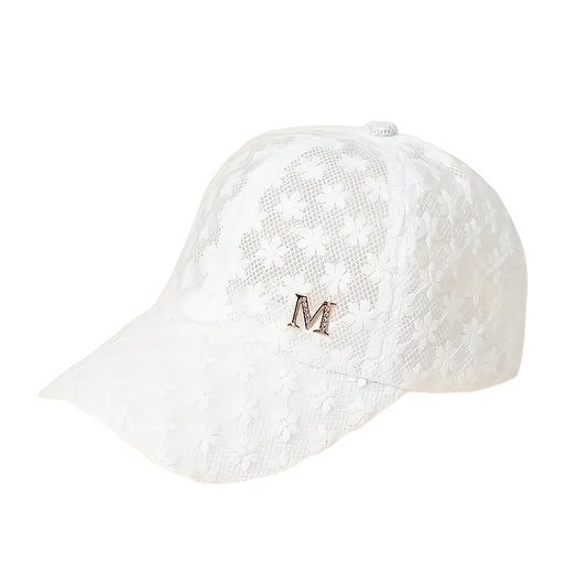 Women's Floral Lace Baseball Cap with Breathable Mesh Back & Embroidered 'M' Detail - Adjustable Snapback Closure, Lightweight Design for Valentine's Day, Casual Outings, City Travel, Outdoor Activities Hat, Embroidered Detai