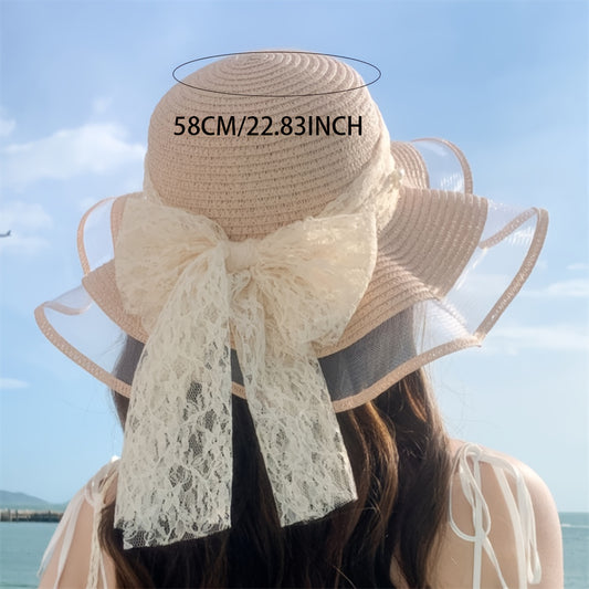 Women'S Elegant Straw Sun Hat with Lace Bow & Mesh Brim - Foldable, Breathable Beach Hat for Summer, Black Ruffled Sleeve Design, Perfect for & Stylish Outfits, Beach Accessories