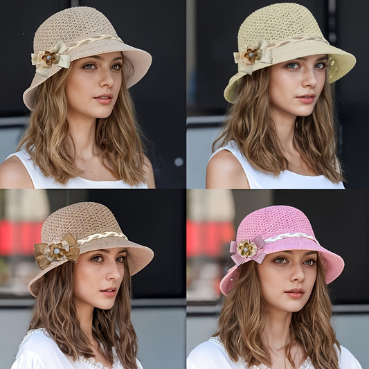 1pc Elegant Women's Floral-Decorated Straw Hat - Breathable Hollow Fisherman Sun Hat with Wide Brim, Jacquard Beige & Brown Summer Beach Hat for Outdoor Travel, Casual Outings & Daily Wear, Fishing Hat, Decorative Bow Accent,