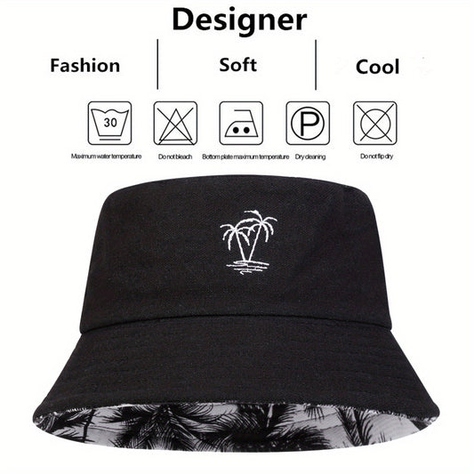 1pc Unisex Bucket Hat - Double-Sided Coconut Tree, Lightweight Fisherman Cap with Wide Brim, Elastic Fit for Beach, Travel, Everyday - Men & Women (Black/White/), Beach Hat, Travel Headwear, Detail