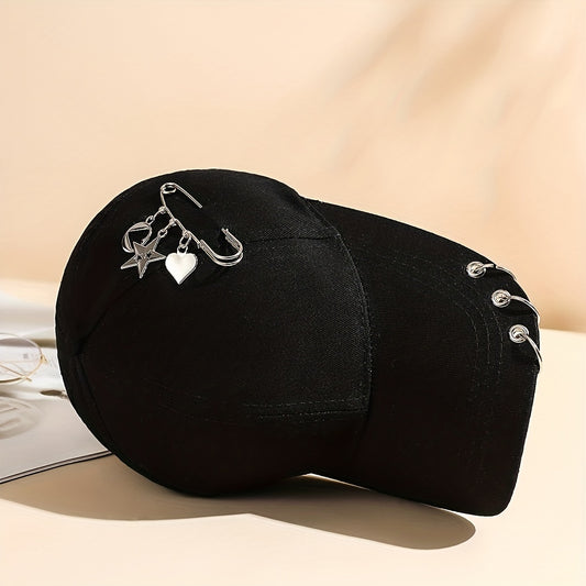 Adjustable Black Polyester Baseball Cap for Women - Trendy Korean Style with Heart & Star Pin, Versatile Fashion Accessory for Spring/Summer, Baseball Cap