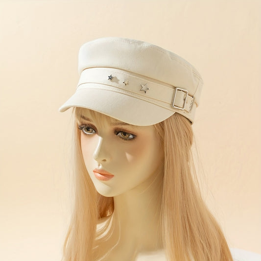 Star Button Newsboy Hat, Y2K Retro Military Hat, Women's Solid Color Newsboy Octagonal Caps Navy Hats