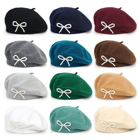 1pc Women's Wool Beret with Pearl Bow - Elegant, Breathable, and Stylish in Multiple Colors (Black, Brown, Gray, Beige, Purple, Pink) for Casual Attire