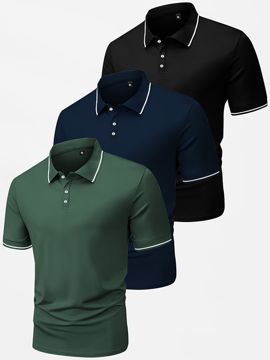 3pcs Men's Casual Fashion Shirts - Breathable Polyester, Short Sleeve, Button-Up with Classic Collar - Machine Washable, Summer Essentials in Black, White, and Beige