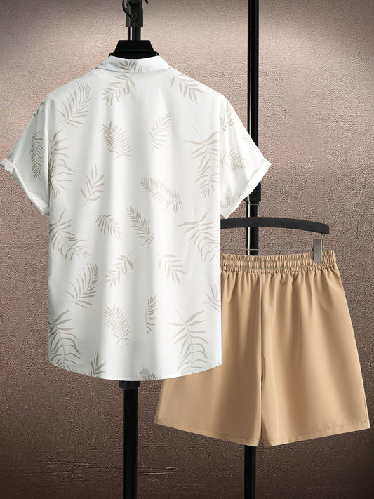 Men'S Casual Two-Piece Summer Outfit - Leaf Print Button-Up Shirt with Drawstring Shorts, Light Brown and White, Polyester, Relaxed Fit, Perfect for Beach or Casual Attire, Beach Attire|Tropical Print|Polyester Fabric