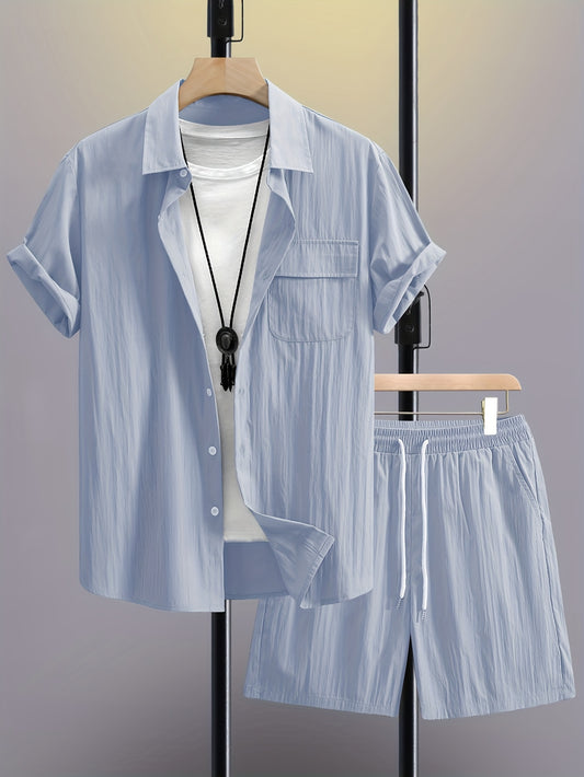 Men'S Summer Casual 2pcs Outfit Set - Polyester 100% Slim Fit Short Sleeve Button-Up Shirt with Lapel Collar & Matching Shorts, Regular Length, Woven Fabric, Slight Stretch, Solid Color - Outdoor Activity Wear