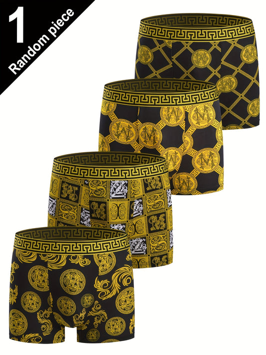 A Pair of Breathable And Soft Men'S Black And Golden Boxer Shorts, Featuring a Stylish Black And Golden Design, Elastic And Comfortable, Perfect for Casual Wear.