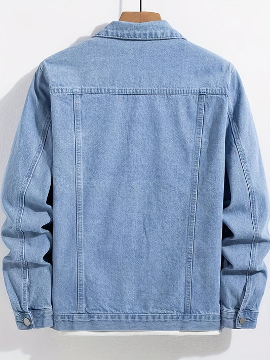 1pc Men'S Casual Slim-Fit Cotton Denim Jacket, Solid Color Lapel Collar with Pockets, Woven Non-Stretch Fabric, 80% Cotton 20% Polyester