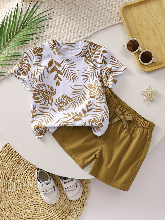 Boys' Tropical Leaf Print Cotton Blend Casual Outfit - Short Sleeve Tee & Drawstring Shorts Set, Machine Washable for Spring/Summer, Perfect for Outdoor