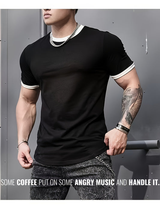 Men's Quick-Dry Athletic T-Shirt - High Elasticity, Breathable Polyester, Black with White Contrast Trim, Round Neck, Short Sleeves for Gym, Running & Basketball, Workout Clothing | Casual Sportswear | Polyester Fabric