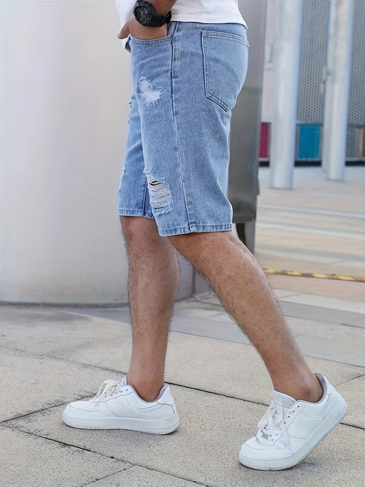 Men'S Casual Ripped Denim Shorts, 85% Cotton 15% Polyester Blend, Knee High, Non-Stretch, Solid Color, Loose Fit Skinny Contour, Woven Fabric, 375g/m² - Summer Fashion