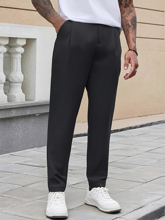 Men'S Casual Straight Leg Trousers, 100% Polyester Woven Fabric, Non-Stretch Solid Color with Pockets, Regular Fit, 190g/m², All-Season Business Casual Pants with Elastic Waistband
