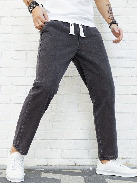 Washed Denim Trousers for Men, Spring and Autumn Trendy Brand, Loose Straight Fit with Elastic Waist and Drawstring, Versatile and Fashionable, Japanese Style, Casual Nine-Fifth Trousers for Spring, Gengyuanshi