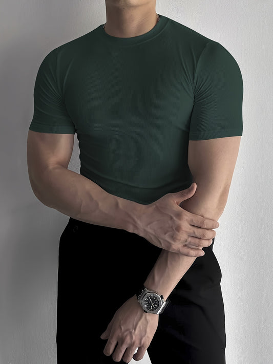 Men's Slim Fit Breathable Ribbed Crew Neck T-Shirt - Short Sleeve, Summer Casual & Sporty Top, Comfortable Stretch Fabric, Solid Color, Machine Washable, Sporty Tshirt | Crew Neck Top | Ribbed Texture