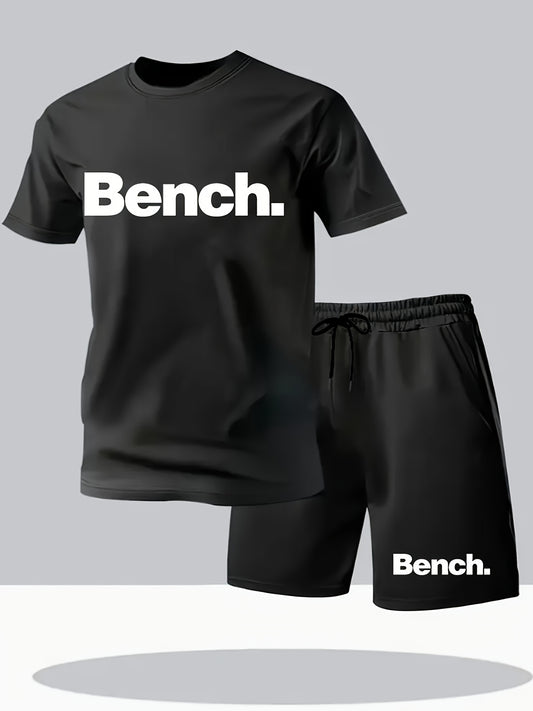 Summer Men'S Casual Sports Short Sleeve T-Shirt and Shorts Set, Knitted Polyester Fabric, Comfortable Breathable, Bench. Letter Print Design - 2pcs