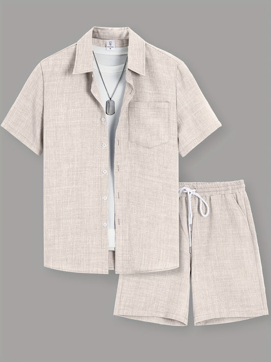 Men'S Casual Summer Two-Piece Set - Short Sleeve Button-Up Shirt with Single Chest Pocket, Drawstring Shorts, Light Beige Polyester, Perfect for Relaxed Outfits, Casual Summer Attire | Relaxed Fit Shorts | Polyester Fabric