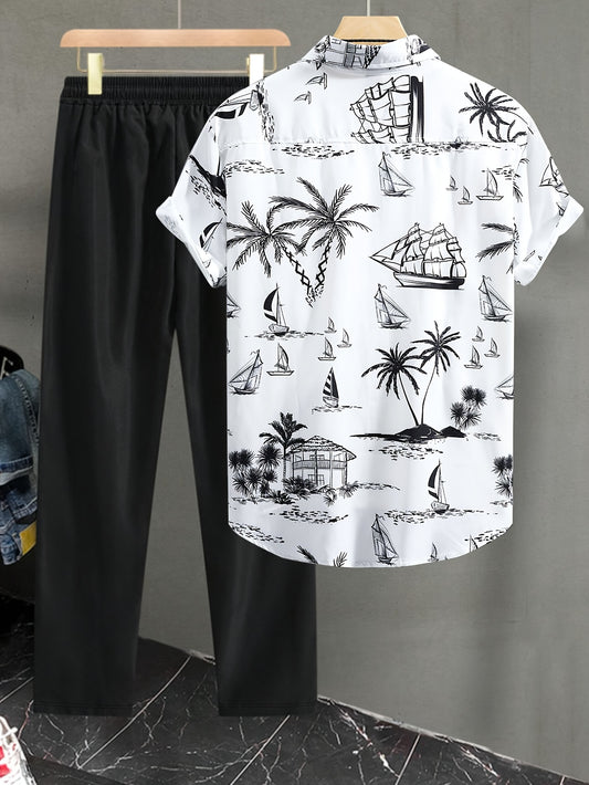 2pcs Summer Casual Everyday Men'S Short Sleeve Shorts Set Hawaiian Print Men'S T-shirt Outdoor Sports Men'S Beach Shorts