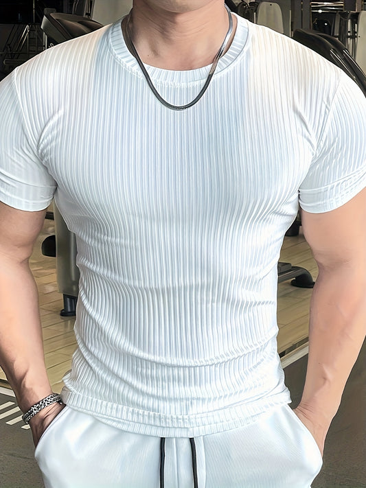Shuleshui OBM Men's Slim Fit Ribbed Short Sleeve T-Shirt - Breathable Summer Workout & Casual Tee, Machine Washable, Solid Color Athletic Top for Gym Training & Outdoor Activities, Gym Clothes, Medium Elasticity