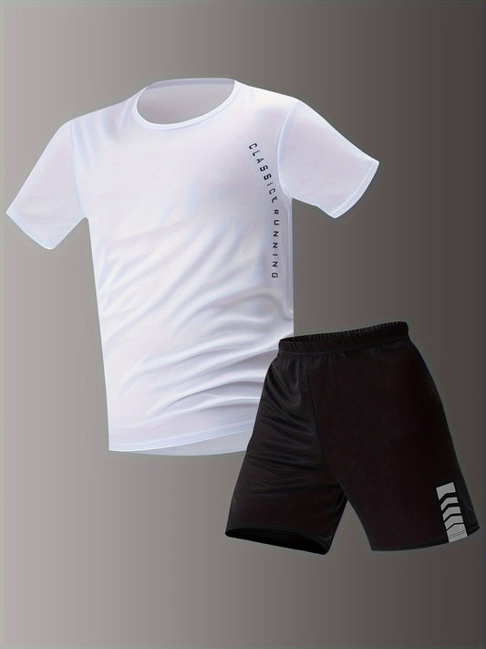 2-piece Men's Summer Sports Outfit Set, Breathable Short Sleeve Crew Neck T-shirt & Elastic Waist Shorts With Pockets For Fitness Work Out