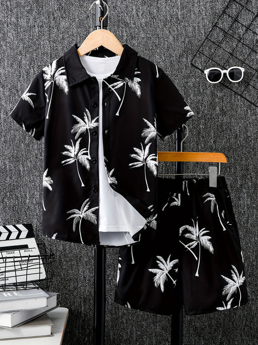 2pcs Boys Casual Coconut Tree Graphic Print Short Sleeve Lapel Shirt & Shorts Set, Comfy Summer Boys Clothing For Daily & Outdoor Wear