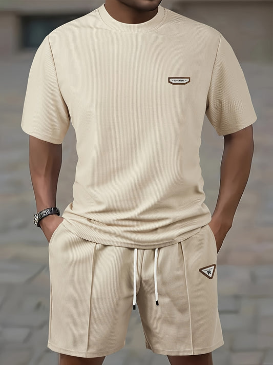 Men's Waffle Round Neck Top with Label, Short Sleeve T-shirt and Drawstring Shorts for Clean and Comfortable Spring/Summer Wear