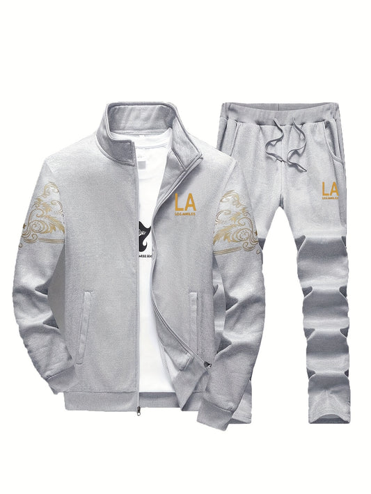 Men's Casual 2-Piece Outfit, Stylish Printed Full Zip Jacket & Drawstring Pants, Casual Sportswear Suit