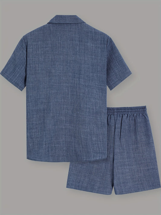 Men'S Summer Casual Short Sleeve Shirt and Drawstring Shorts Set, Solid Color, Lapel Collar, Button Detail, Regular Fit, 100% Polyester, Woven Fabric, Medium Stretch