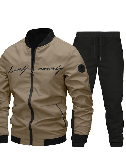 2pcs Men's Classic Bomber Jacket & Jogging Pants Set - Sleek Black with Letter Embroidery, Elastic Cuffs & Waistband, Durable Polyester, Perfect for Outdoor Activities & Casual Wear, Jogging Suits