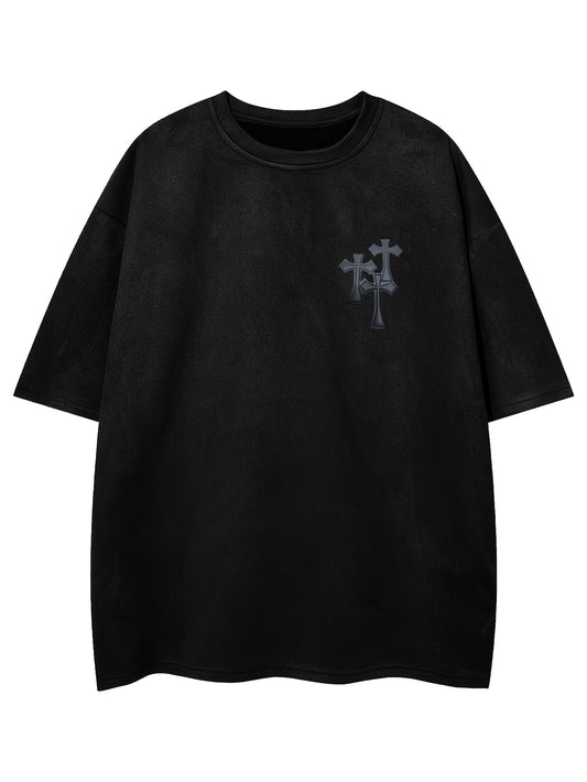 Men's Casual Black Suedette Short-Sleeve T-Shirt with Print Cross Design - Soft, Loose Fit, Round Neck, Summer Tee for Adults, Summer Casual Wear | Casual Shirt | Faux Suedette Texture