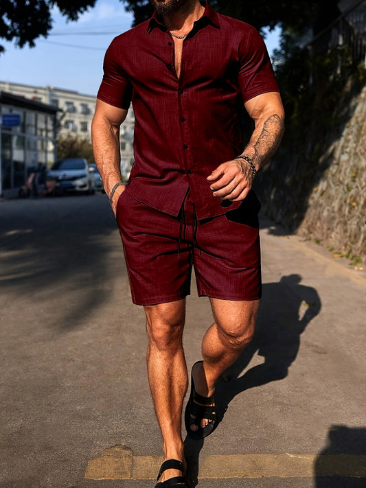 Men's Outfit, Checkered Print Lapel Short Sleeve Button Up Shirt & Shorts 2pcs co ord set for Outdoor Activities