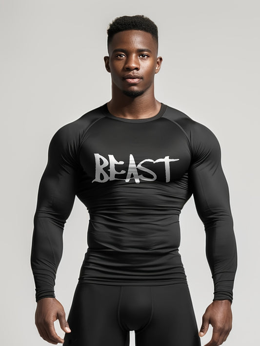 Men's Athletic Long Sleeve Compression Shirt - "BEAST" Print, Quick-Dry, Moisture-Wicking, Breathable Polyester-Spandex Blend, Ideal for Gym, Running, Basketball, and Outdoor Activities, Gym Clothes