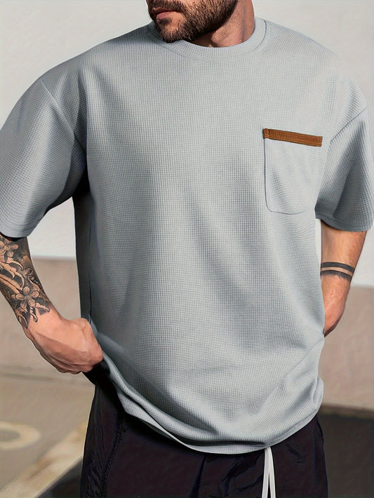 Men's Solid T-shirt With Chest Pocket, Casual Short Sleeve Crew Neck Tee, Men's Clothing For Summer Outdoor